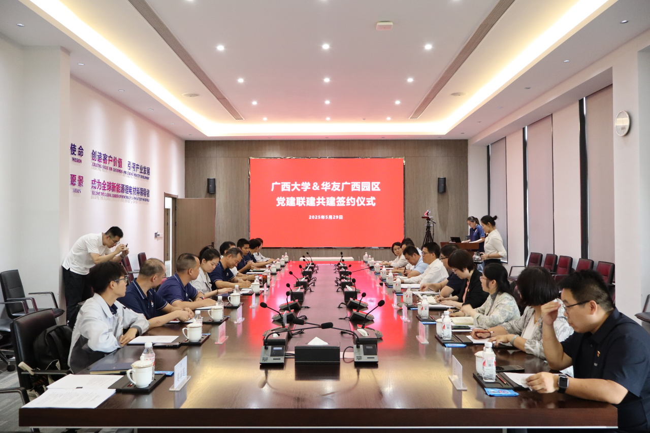 2025年5月29日,廣西大學(xué)黨委副書(shū)記寧旭初率隊(duì)到華友廣西產(chǎn)業(yè)園開(kāi)展了黨建聯(lián)建共建活動(dòng),華友廣西園區(qū)黨委書(shū)記徐學(xué)良熱情接待。雙方就黨建共建、科研合作、人才培養(yǎng)、資源共享等議題進(jìn)行了深入交流,并舉行了黨組織結(jié)對(duì)共建簽約儀式和實(shí)訓(xùn)基地揭牌儀式。