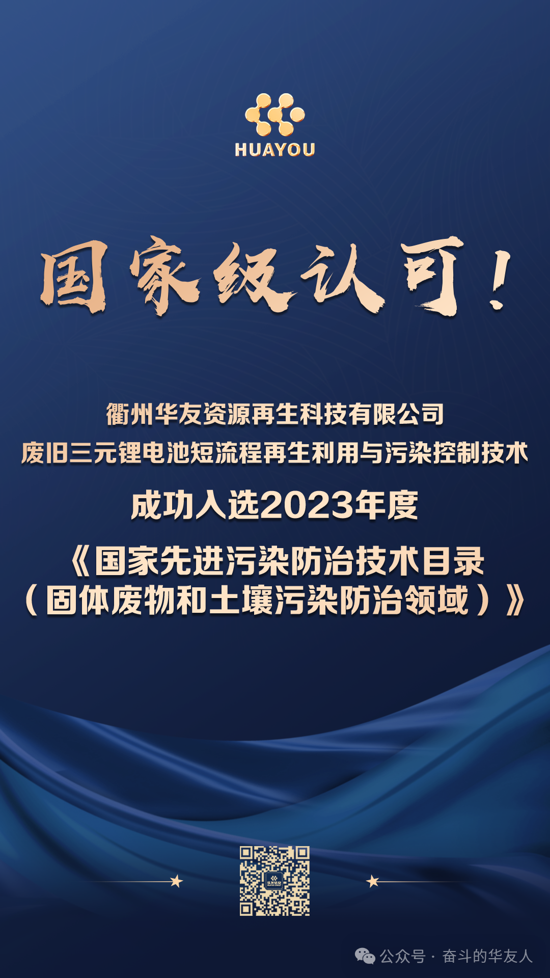Recently, the technology independently developed by Quzhou Huayou Resource Recycling Technology Co., Ltd. — the short process for recycling and pollution control of waste ternary lithium batteries — was successfully selected for the "once every three years" 2023 National Catalogue of Advanced Pollution Control Technologies (for Solid Waste and Soil Pollution Control) (hereafter referred to as the "Catalogue"). In the field of ternary lithium battery recycling, only two companies nationwide were selected for this national-level demonstration technology in the solid waste pollution control domain.