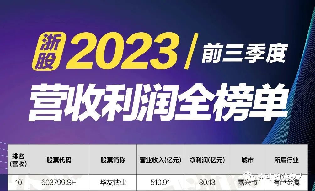 11月1日,浙商雜志公布浙江A股上市公司2023年前三季度營收、利潤全榜單,共有691家公司上榜。華友鈷業(yè)以510.91億元的營收、30.13億元的凈利潤雙雙位居第十,交上了一份高水平開放引領高質(zhì)量發(fā)展的高分答卷!