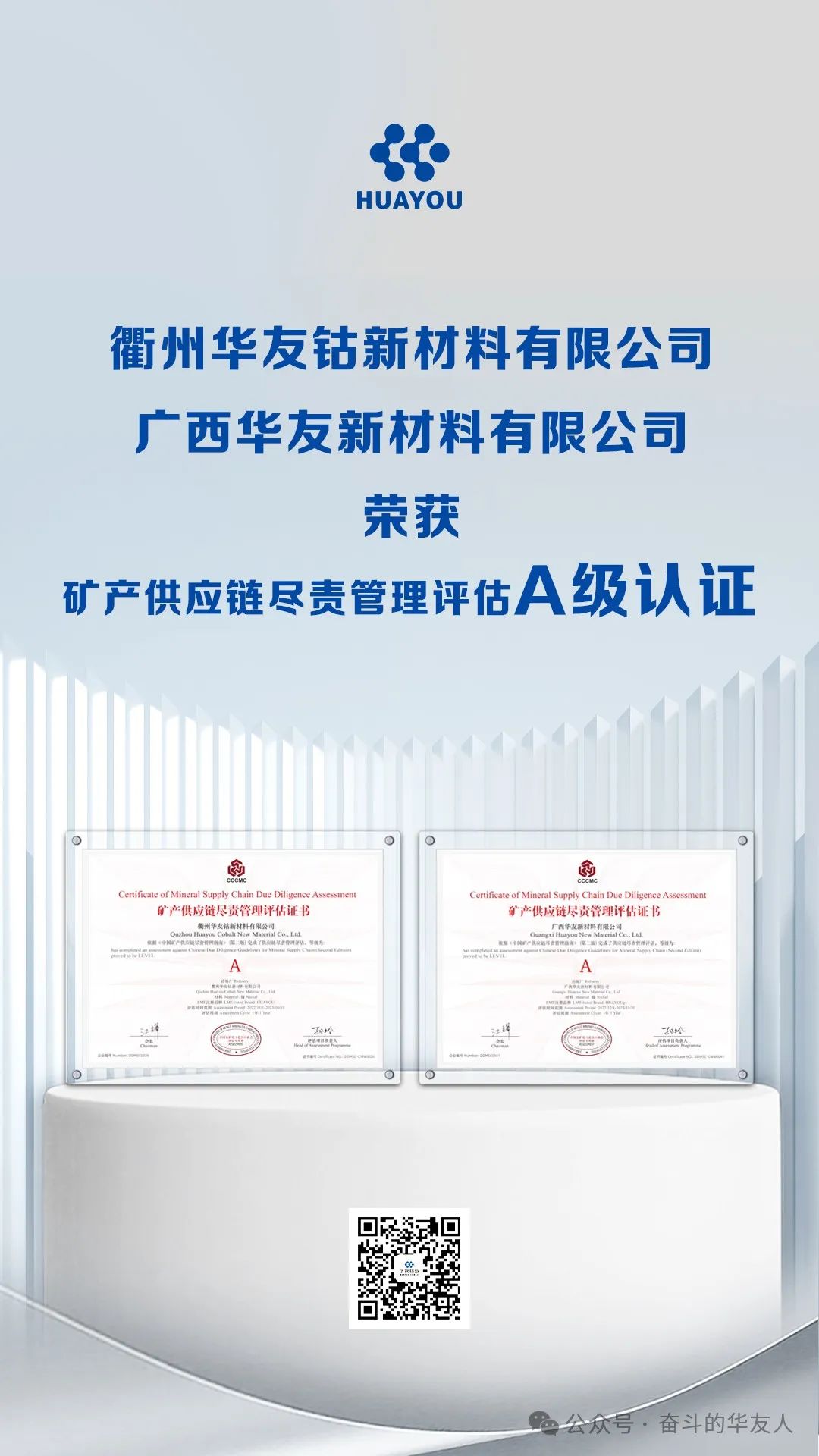 衢州華友鈷新材料有限公司和廣西華友新材料有限公司電鎳率先通過礦產供應鏈盡責管理評估,中國五礦化工進出口商會頒發(fā)了礦產供應鏈盡責管理評估A級證書。