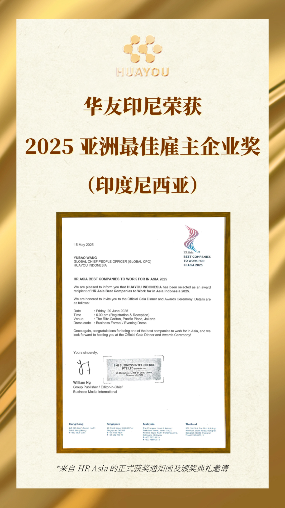 5月15日,亞太權(quán)威人力資源機(jī)構(gòu) HR Asia 公布“2025亞洲最佳雇主qm球盟會(huì)·(中國)球盟會(huì)獎(jiǎng)”(Best Companies to Work for in Asia)評選結(jié)果。華友首次參評即榮膺印尼地區(qū)最佳雇主qm球盟會(huì)·(中國)球盟會(huì)品牌稱號(hào),這是華友在印尼發(fā)展歷程中的重要里程碑,更是對公司長期踐行本地化人才戰(zhàn)略和履行qm球盟會(huì)·(中國)球盟會(huì)社會(huì)責(zé)任的高度認(rèn)可。