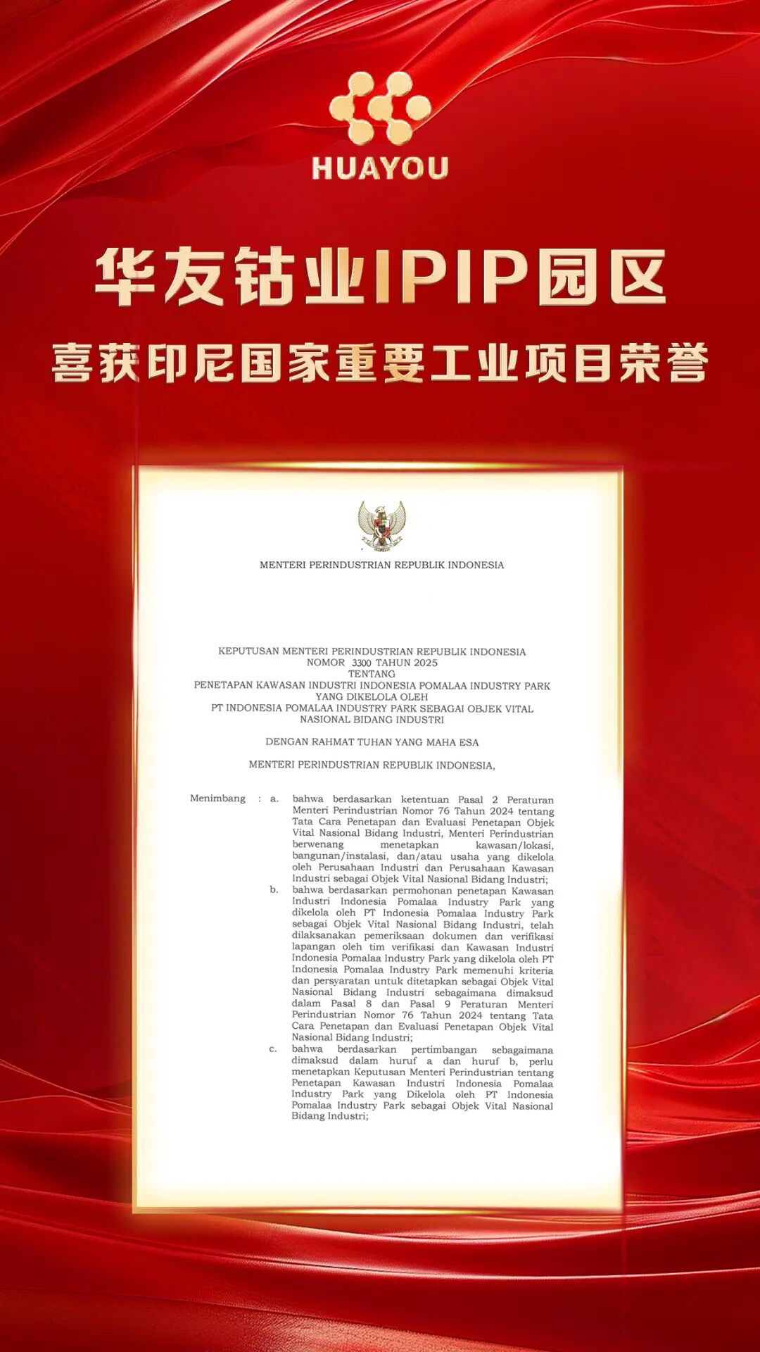 國家級(jí)認(rèn)可!華友IPIP園區(qū)獲印尼國家重要工業(yè)項(xiàng)目榮譽(yù)