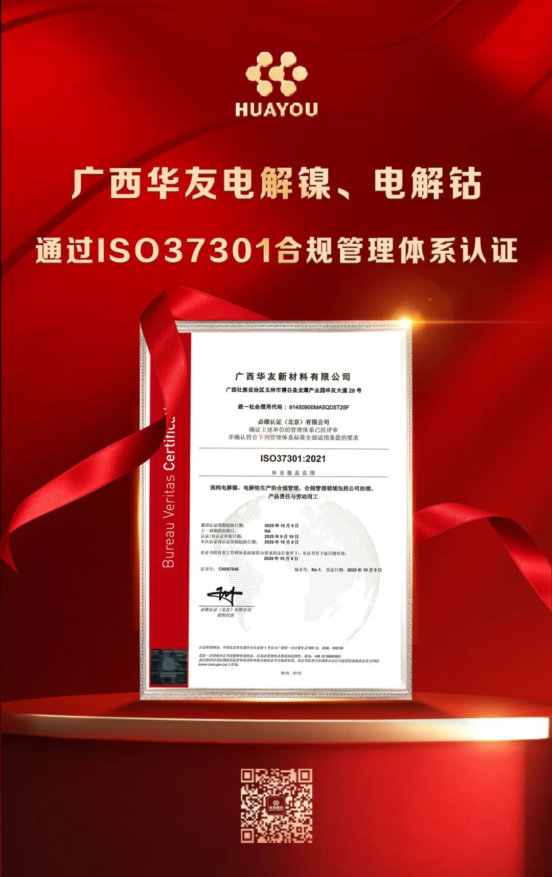 近日,華友鈷業(yè)旗下廣西華友新材料有限公司正式獲得國際權(quán)威認證機構(gòu)頒發(fā)的ISO 37301合規(guī)管理體系認證證書,為華友國際化戰(zhàn)略奠定了堅實的合規(guī)基礎(chǔ)。
