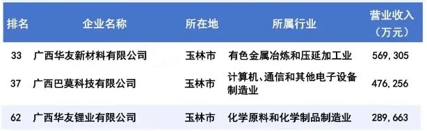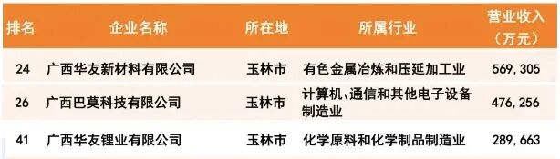 在廣西民營qm球盟會·(中國)球盟會100強榜單中,廣西華友新材料有限公司位列第33名,廣西巴莫科技有限公司緊隨其后排名第37位,廣西華友鋰業(yè)有限公司位居第62名;